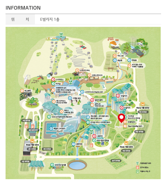 부대시설 위치 : 중앙 시계탑 광장 뒤쪽 스키하우스 건물에 의무실이 있고, 바로 아래쪽 건물에 GS25(B1F)가 위치해있습니다.