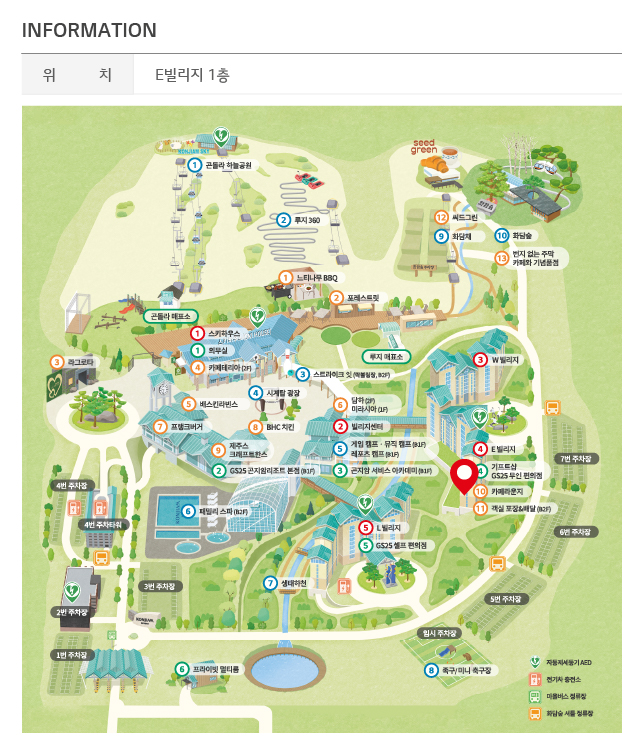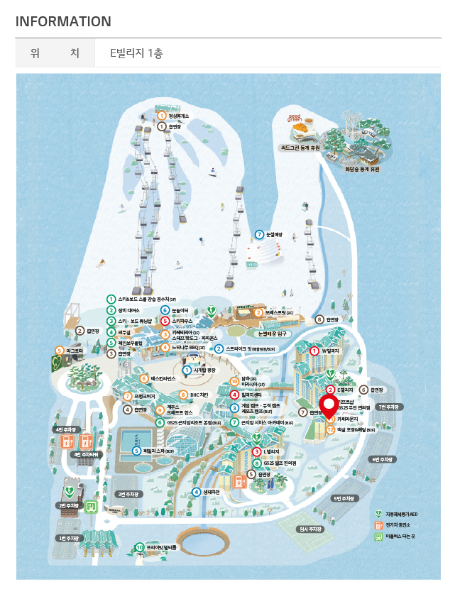 빌리지센터 기준으로 상단에는 스키하우스가, 우측으로는 W빌리지, E빌리지가 위치해있습니다.