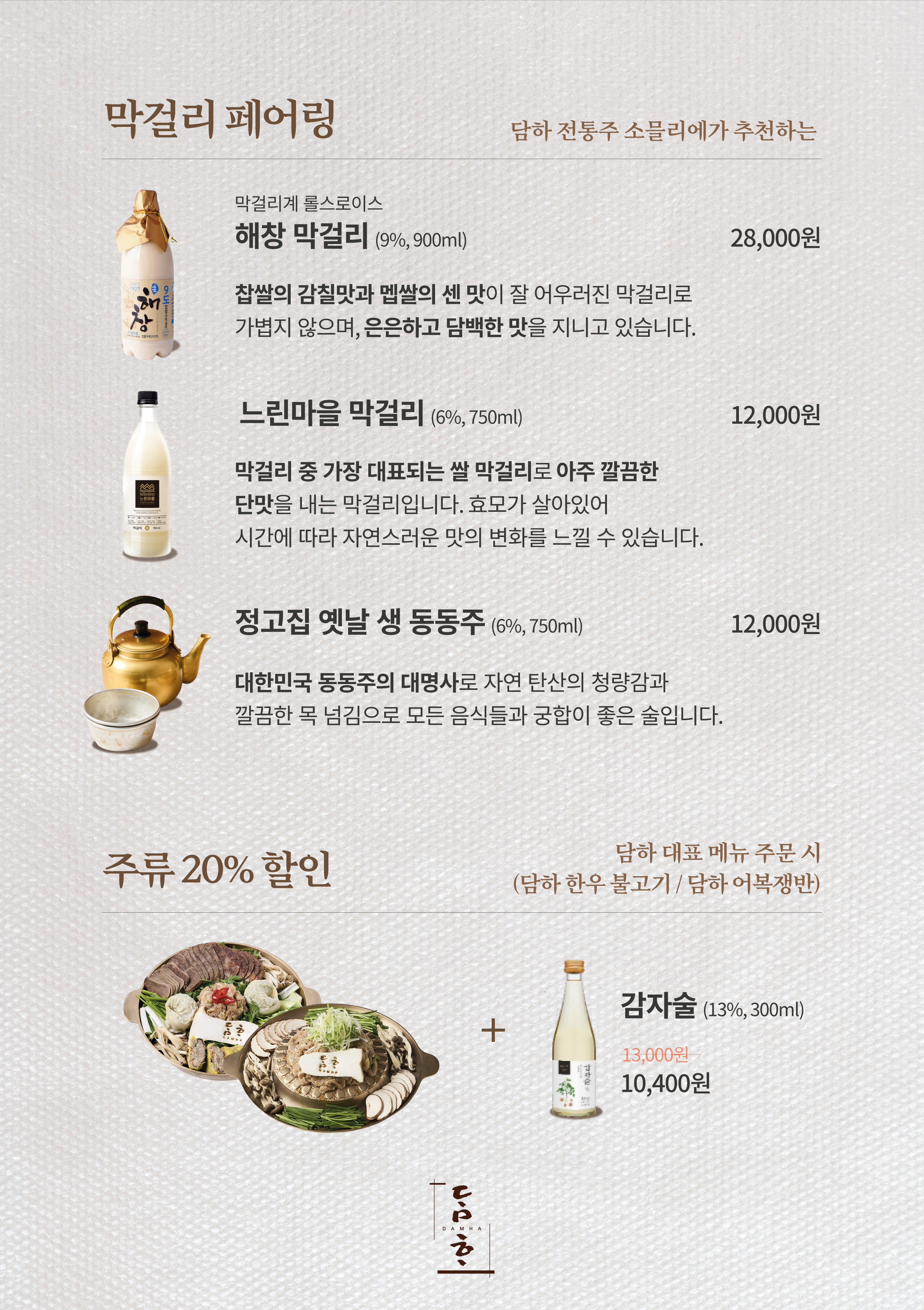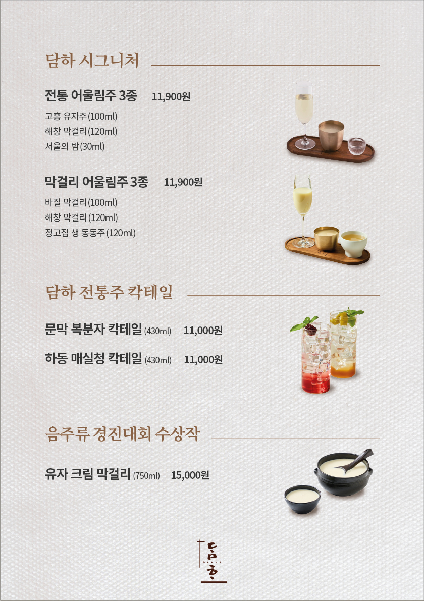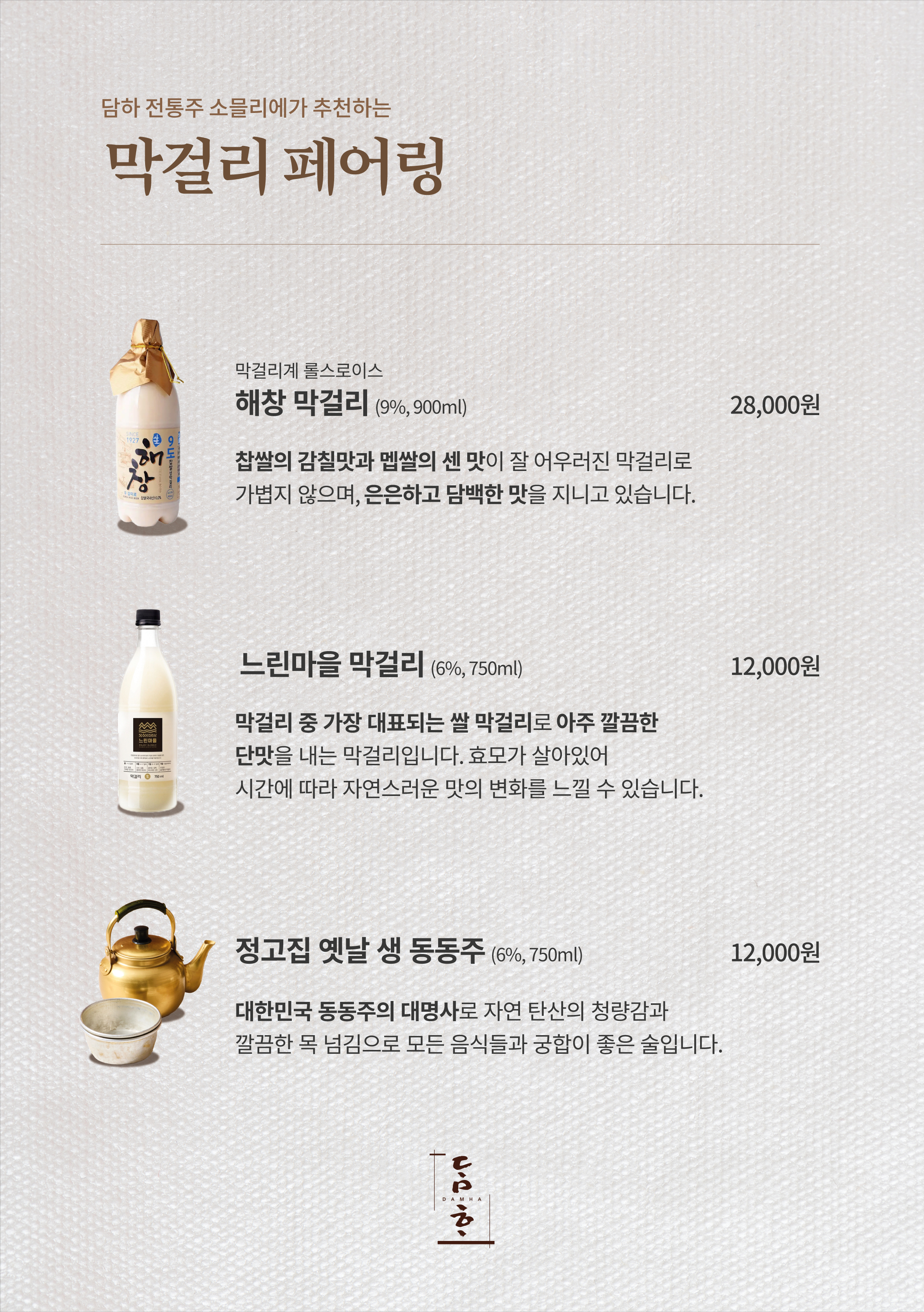 * 바질 막걸리 100ml, 해창 막걸리 120ml, 정고집 생 동동주 120ml
