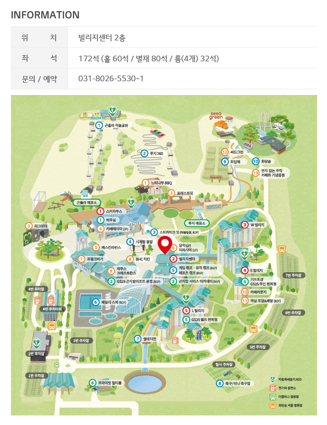 즐길거리 위치 : 지도상 제일 중앙에 시계탑 광장이 있으며 W빌리지 방향으로 게임캠프와 뮤직캠프(B1F)/레포츠 캠프(B1F), 바로 아래쪽에는 스파라스파(패밀리스파,곤지암웰니스)가 위치해있습니다.