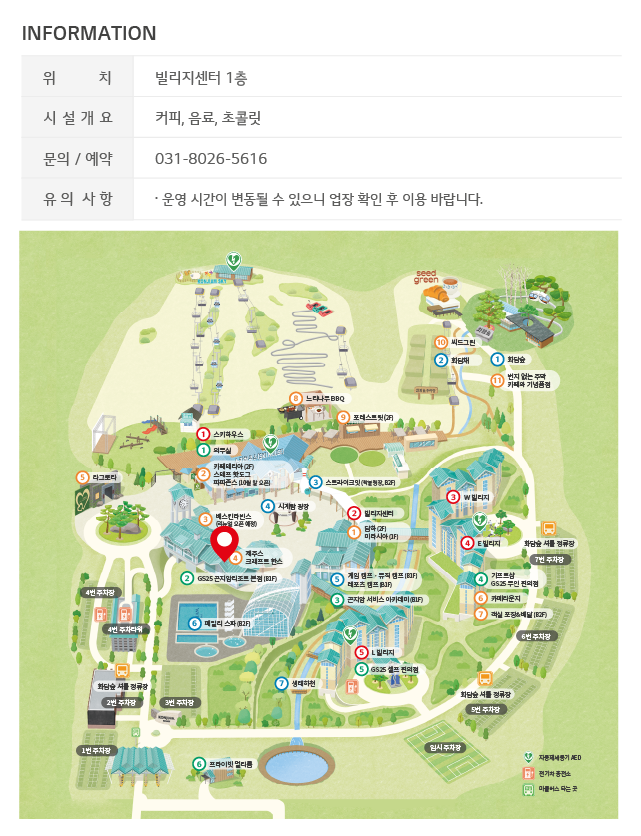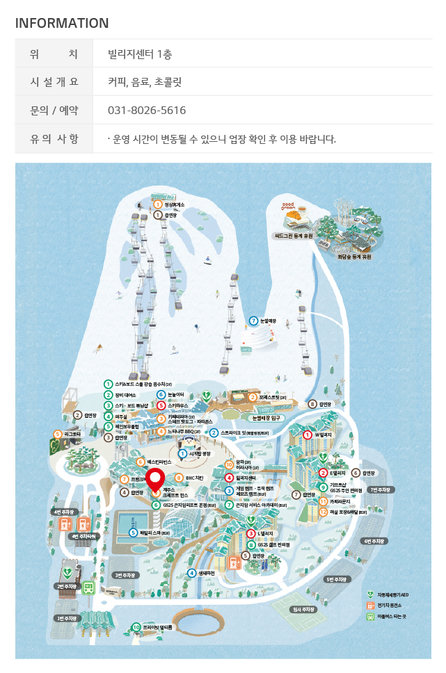 부대시설 위치 : 중앙 시계탑 광장 뒤쪽 스키하우스 건물에 의무실이 있고, 바로 아래쪽 건물에 GS25(B1F)가 위치해있습니다.