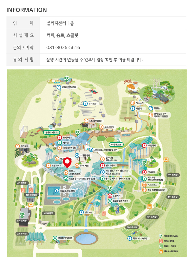 자동제세동기 AED 위치 : 의무실 및 2번 주차장, 곤돌라 하늘공원, L빌리지, E빌리지 쪽에 위치해있습니다.