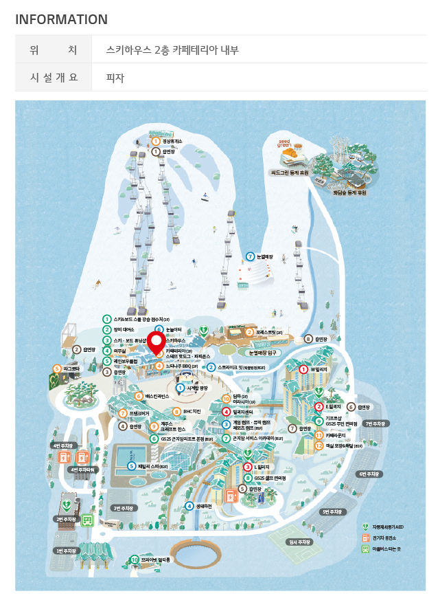 부대시설 위치 : 중앙 시계탑 광장 뒤쪽 스키하우스 건물에 의무실이 있고, 바로 아래쪽 건물에 GS25(B1F)가 위치해있습니다.