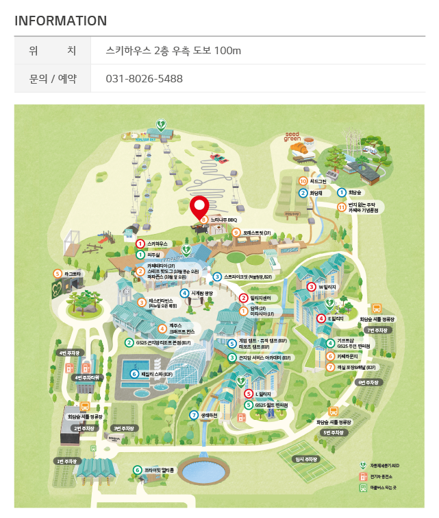 부대시설 위치 : 중앙 시계탑 광장 뒤쪽 스키하우스 건물에 의무실이 있고, 바로 아래쪽 건물에 GS25(B1F)가 위치해있습니다.