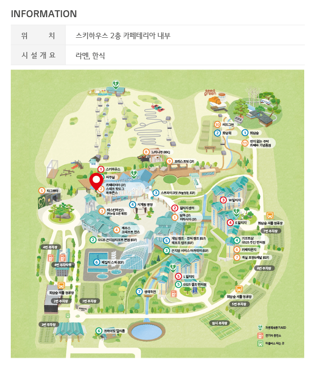 콘도 위치 : 중앙 시계탑 광장 바로 우측에 4.빌리지센터가 위치해있고 그 아래쪽에는 3.L빌리지가 있습니다. 4.빌리지센터 기준으로 상단에는 5.스키하우스가, 우측으로는 1.W빌리지, 2.E빌리지가 위치해있습니다. 식음시설 위치 : 화담숲리프트탑승장을 지나 화담숲 입구쪽에 1.씨드그린이 위치해있고, 탑승장 좌측에는 4.포레스트릿, 11.느티나무BBQ가 차례로 있습니다. 지도상 제일 좌측 중앙에 3.라그로타, 라그로타에서 중앙 시계탑광장으로 가는길에 2.카페테리아가 위치해있으며 시계탑광장 시계반대방향으로 7.배스킨 라빈스, 12.파파존스/스태프핫도그, 10.BBQ, 9.제주스/크래프트 한스, 8.담하(2F)/미라시아(1F)가 있습니다. E빌리지 바로 우측에는 5.카페라운지와 6.객실포장·배달이 위치해있습니다. 즐길거리 위치 : 지도상 제일 중앙에 1.시계탑 광장이 있으며 W빌리지 방향으로 2.게임캠프(B1F), 뮤직캠프(B1F), 곤지암 스포츠 센터(B1F), 바로 아래쪽에는 5.스파라스파(패밀리스파,곤지암웰니스)가 위치해있습니다. 스파라스파를 지나 더 아래쪽으로 가면 3.생태하천이, 생태하천에서 L빌리지를 지나면 4.어린이 놀이터가 있습니다. 지도상 제일 위쪽에 9.곤돌라 하늘공원이, 그 아래쪽으로 7.루지와 6.곤돌라가 차례로 위치해있습니다. 지도상 우측방향 위쪽으로 화담숲 리프트 탑승장을 지나면 10.화담채와 8.화담숲이 있습니다. 부대시설 위치 : 중앙 시계탑 광장 뒤쪽 스키하우스 건물에 1.의무실이 있고, 바로 아래쪽 건물에 2.GS25(B1F)가 위치해있습니다. E빌리지 바로 옆에 4.기프트샵이, L빌리지 바로 아래쪽에 5.셀프편의점이 있습니다. 제일 아래쪽 출입구쪽 우측에 3.프라이빗 멀티룸이 위치해있습니다. 주차장 위치 : 지도상 제일 아래쪽 좌측에 출입구 바로 옆에 1번 주차장이, 그 위로 2번주차장, 4번 주차타워, 4번 주차장이 차례로 위치해있습니다. 2번주차장 맞은편에는 3번 주차장이 있으며, 어린이 놀이터 위치에 임시주차장이, 그 옆으로 5번 주차장, 6번 주차장, 7번 주차장이 위치해있습니다. 자동제세동기 AED 위치 : 1.의무실 및 2번 주차장, 9.곤돌라 하늘공원, 3.L빌리지, 2.E빌리지 쪽에 위치해있습니다. 전기차 충전소 위치 : 4번 주차장, 4번 주차타워 및 3.L빌리지 앞쪽에 위치해있습니다. 마을버스 타는 곳 위치 : 제일 아래쪽 좌측 출입구를 지나 2번 주차장 가기 전 정류장이 있습니다.