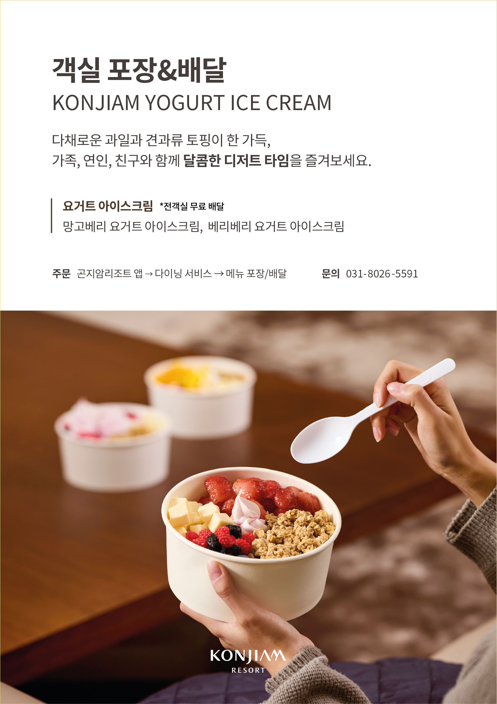 딸기! 초코! 망고! 컬러풀한 토핑이 한 스푼에 가득한 곤지암 요거트 아이스크림으로, 프라이빗한 객실에서 달콤한 디저트 타임을 즐겨보세요. 니다.