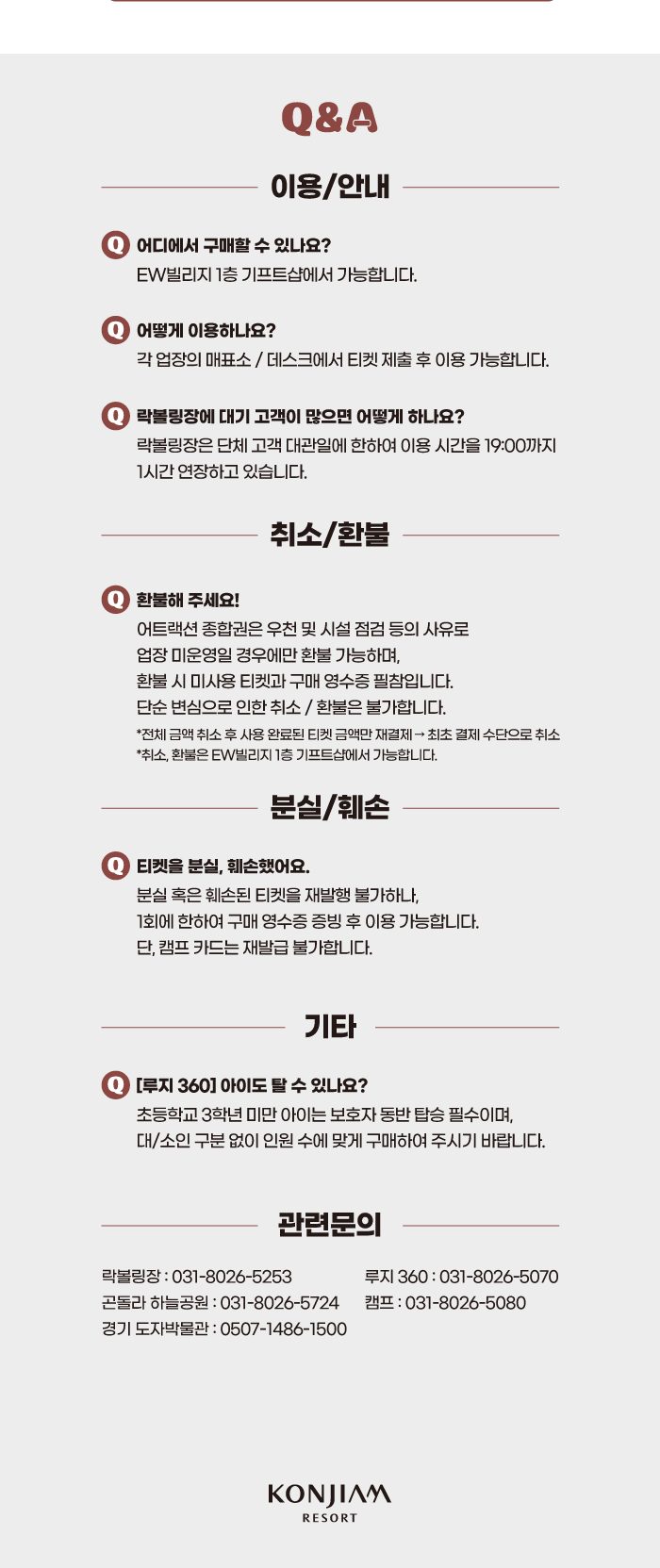 락볼링장 : 031-8026-5253 / 곤돌라 하늘공원 : 031-8026-5724 / 경기 도자박물관 : 0507-1486-1500 / 루지 360 : 031-8026-5070 / 캠프 : 031-8026-5080