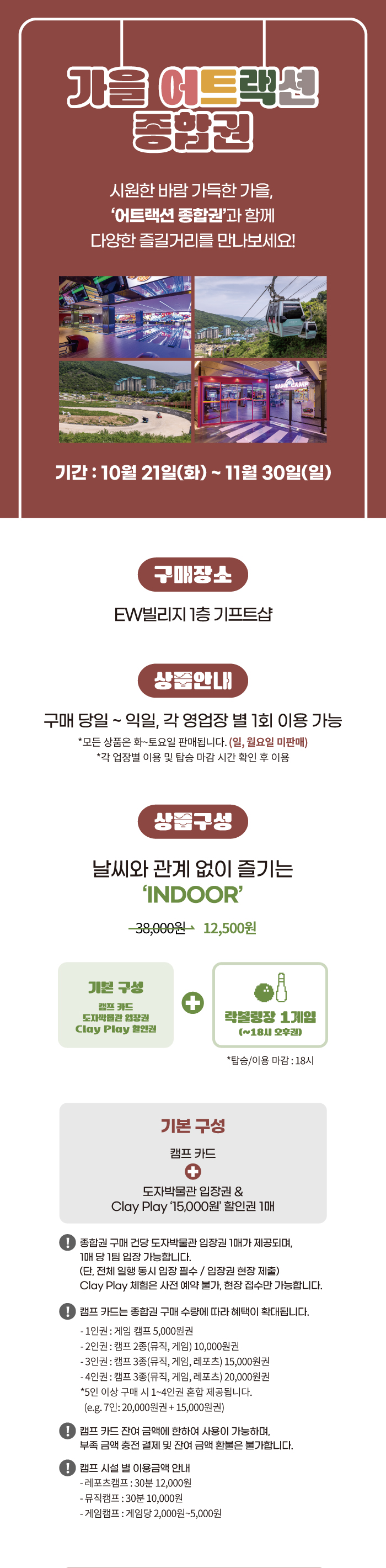 기본 구성 (캠프 카드, 도자박물관 입장권, Clay Play 15,000원 할인권)에 18시부터 락볼링장 1게임 이용 가능한 오후권과 루지 360, 곤돌라 하늘공원 탑승권 각 1매가 포함된 권종입니다.
