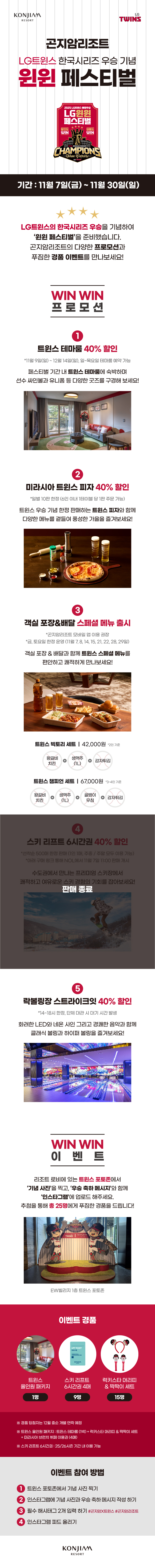 LG트윈스의 한국시리증 우승을 기념하여 ‘윈윈 페스티벌’을 준비했습니다. 곤지암리조트의 다양한 프로모션과 푸짐한 경품 이벤트를 만나보세요.